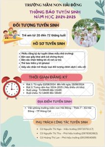 Đội ngũ giáo viên của trường được đào tạo bài bản, luôn tận tâm và yêu nghề, chú trọng xây dựng nền tảng nhân cách, trí tuệ và kỹ năng sống cho các bé. Chương trình giáo dục tại đây kết hợp hài hòa giữa phương pháp truyền thống và hiện đại, khuyến khích trẻ khám phá, học hỏi và phát triển toàn diện. Trường Mầm Non Hải Đông không chỉ là nơi trẻ em được học tập mà còn là ngôi nhà thứ hai, nơi các bé được yêu thương, chăm sóc và phát triển trong tình yêu thương vô bờ bến.